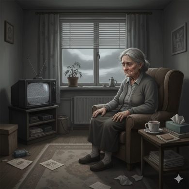 白髪の女性の方(80代後半)のお宅に伺いました。家の中は静まり返り、テレビの声だけが響いています。